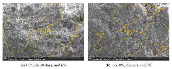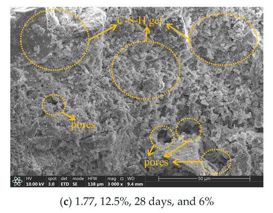 Figure 8 and Figure 6a shows the changes in the microstructure of cement–loess under different cement dosages. The curing age affected the degree of cement hydration reaction, while the cement dosage affected the final amount of cementitious materials generated. A layer of C-S-H gel covering appeared on the surface of loess particles, and with an increasing cement dosage, the production of cementitious products increased. The structure characterized by a distribution of large and small pores became increasingly filled with cementitious materials, creating a bulky mass of amorphous gel clusters that surrounded dispersed blocks and particles at lower cement dosages. The C-S-H gel hydration products that formed at a cement dosage of 6% displayed a dispersed pattern on the surface of the particles, while at cement dosages of 9 and 12%, a dense and indistinguishable whole was formed between loess particles and cementitious materials. These microstructural changes due to varying cement dosages correspond to an increase in cement–loess electrical resistivity.