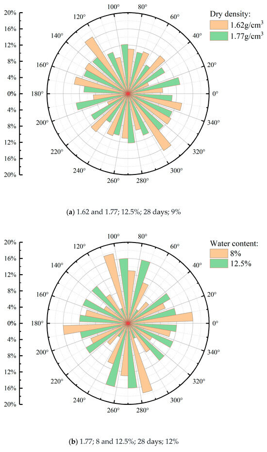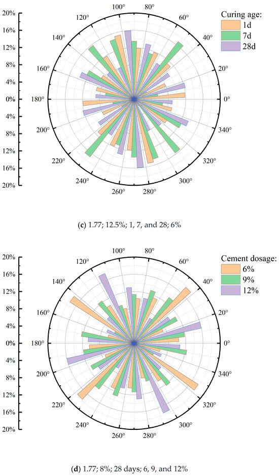 The directional frequency distribution of cement–loess pores under the conditions (dry density; water content; curing age; cement dosage, respectively) of different dry densities (a), different water contents (b), different curing ages (c), and different cement dosages (d).
