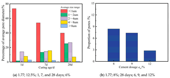 For the analysis of pore number and pore size, we selected the conditions of Figure 7 and Figure 8, which contain a larger number of microstructural SEM images, to conduct the analysis of average pore diameter and pore area ratio. In Figure 10a, as the curing age increases, small pores are gradually filled by cementitious products, resulting in a decrease in the proportion of pores smaller than 1 μm over time. The filling of small pores by cementitious products, along with the partial filling of larger pores, leads to a more uniform average pore diameter. In Figure 10b, the increase in the cement dosage provides a stable source for the synthesis of cementitious products, resulting in the generation of more cementitious products. This explains why the pore area ratio decreases as the cement dosage increases.