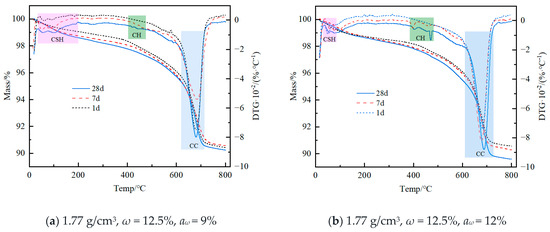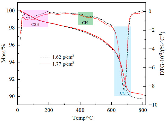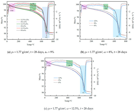 Comparative analysis of TG/DTG under different dry densities (ω = 12.5%, t = 28 days, aω = 9%).