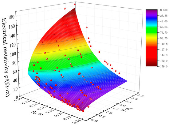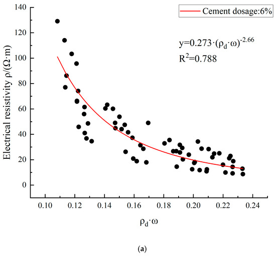 With regard to Equation (6) and the correlation with the experimental data, an analysis of the relationship between resistivity, dry density, and water content (ρd·w) was established.