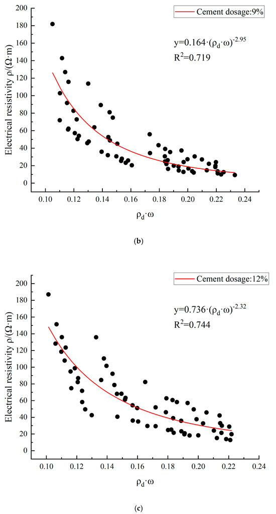 The fitting curves of cement–loess resistivity with dry density and water content (ρd·ω) under cement dosages of 6 (a), 9 (b), and 12% (c).