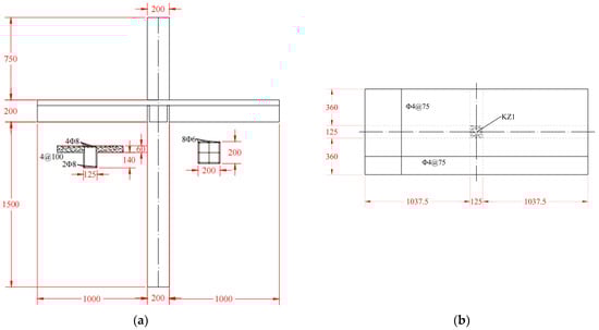 Specimen size and reinforcement (mm). (a) Elevation view; (b) Plan view.