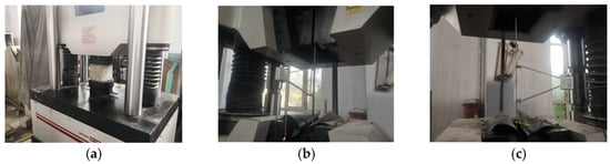 The longitudinal reinforcements of the specimens comprised HRB400 Grade III steel, and the stirrup and plate reinforcement were made of HPB300 Grade III steel. To determine the mechanical properties of the materials used in the quasi-static specimens and obtain material property data for subsequent finite element models, tensile tests on the longitudinal reinforcement and stirrup, as well as compression tests on the concrete, were conducted according to standard ISO 6892-1:2019 []. The test site is shown in Figure 2. The material properties of the concrete (C30), longitudinal reinforcement, and stirrup are presented in Table 2 and Table 3.