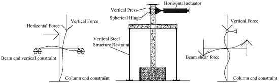 The loading device used in the quasi-static test was mainly composed of a hydraulic actuator, a reaction frame, and hydraulic jacks. The actuator was fixed to the reaction frame, and a hydraulic jack was used to apply vertical loads at the top of the column to simulate axial pressure. The hydraulic jacks were also fixed to the reaction frame. The horizontal actuator was equipped with a built-in force–displacement transducer to record hysteresis curves during the test. The jack had a horizontal slide, ball hinges, and a force transducer, and the slide and ball hinges ensured that the vertical load acted vertically downward throughout the test. A predetermined vertical load of 340 kN was applied to the top of the column, with an axial pressure ratio of 0.6 (see Figure 3).