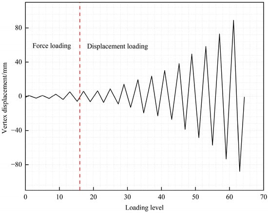 This test was conducted by applying quasi-static test procedures based on previous research on quasi-static tests. A force–displacement hybrid control loading method was adopted. Initially, force control loading was applied, with the first load level set at 5 kN, and then incrementally increased by 5 kN until structural cracking or a significant drop in the load–displacement curve was observed. Subsequently, displacement control loading was applied. Specifically, each loading step involved increasing the lateral displacement by an amount equal to double the cracking displacement, and reciprocal cycles were performed twice for each step. Loading was continued until the specimen reached its ultimate state, corresponding to severe damage, such as stirrup fracture and marked spalling of the concrete. At this point, the loading was terminated. The loading method is shown in Figure 4.