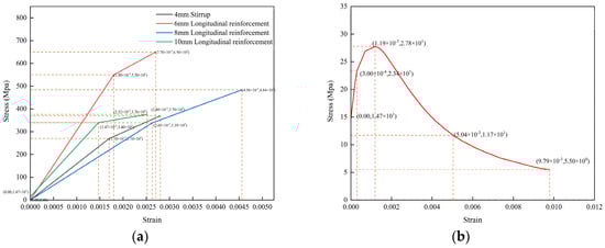 Constitutive curves of the materials. (a) Stress–strain relation curve of reinforcement; (b) Constitutive curves of concrete.