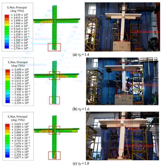 Figure 7b shows that when the amplification factor of the bending moment at the end of the column is 1.6 and the displacement is 96 mm, the hoop reinforcement at a distance of 30 cm from the base of the column breaks, causing the specimen to sink as a whole. The top axial pressure is not constant, and the test stops. After the test loading is completed, concrete is crushed and peeled off within 50 cm of the bottom of the column. The specimen forms a plastic hinge at the bottom of the column. The stress at the lower end of the beam in contact with the column in the finite element analysis model is also high, resulting in cracking and crushing, which is similar to the multiple cracks, concrete crushing, and steel yield at the beam end in the experimental model.