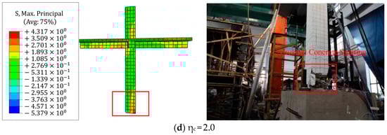 As shown in Figure 7d, when the amplification factor of the bending moment at the column end is 2.0 and the lateral displacement of the structure reaches 85 mm, the specimen sinks as a whole, the top axial pressure is not constant, and the test stops. The concrete is crushed and peeled off within 50 cm of the bottom of the column, completely exposing the steel bars. Test piece 5 forms a plastic hinge at the bottom of the column. In the finite element analysis model, the stress at the lower end of the beam in contact with the column is still high. However, in the corresponding experimental model, although multiple cracks and concrete spalling appeared at the beam end, the yield of the steel bars was not significant.