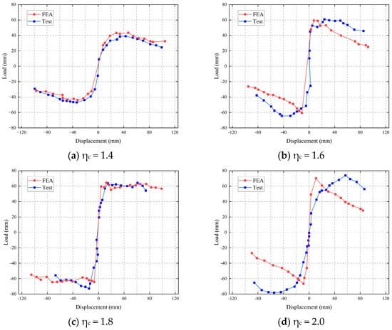 Regarding Specimen 4 (Figure 8d), the skeleton curves of the FEA model and the test model exhibit good consistency in the early stages of loading. The depicted load–displacement curves of the FEA model and the test model under positive and negative loading show similar trends, with a peak load error of approximately 7%. After reaching the peak, the loading curve of the FEA model exhibits a rapid downward trend, which could be caused by errors in material parameter settings, boundary condition treatment, or physical phenomena that were not fully captured. However, overall, when the column end bending moment amplification factor is 2.0, the FEA model can still accurately reflect the mechanical behavior of the test model, which demonstrates its reliability.