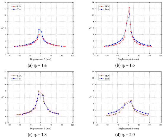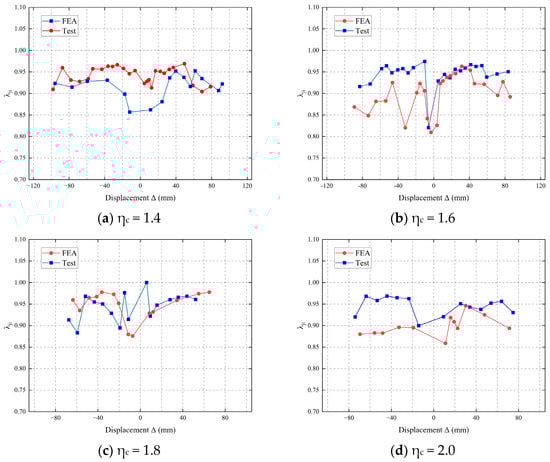 Figure 9a shows that the load-bearing capacity degradation coefficient of the test fluctuates between 0.92 and 1.00, whereas that of the FEA fluctuates between 0.88 and 0.95. All the load-bearing capacity degradation coefficients are less than 1, indicating that neither the test nor the FEA reveals any significant stiffness degradation. Overall, the FEA results align well with the test results, demonstrating similar fluctuation trends, which indicates the reliability of the model.