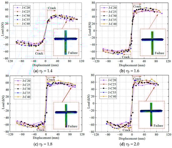 The skeleton curves and energy dissipation curves of beam–column joints with different concrete strengths (J-C20, J-C25, J-C30, and J-C35) are shown in Figure 11 and Figure 12. The variation trends of the skeleton curves of the beam–column joints with different concrete strengths are consistent, and the stress cloud diagrams are similar. As the concrete strength increases, the beam–column joints with higher concrete strength demonstrate better bearing capacity and deformation ability due to their high compressive strength and crack-control capability. When the concrete strength of the beam–column joint increased from C20 to C40, the load-bearing capacity of the structure increased by 1.31–26.88%. The change in concrete strength has a significant impact on this joint area. For example, with a column end bending moment amplification factor of 1.6, the load-bearing capacities of the J-C25, J-C30, J-C35, and J-C40 specimens increased by 5.31%, 8.61%, 12.86%, and 20.56%, respectively, compared to that of the J-C20 specimen. When the column end bending moment amplification factor was 2.0, compared to that of the J-C20 specimen, the load-bearing capacities of the J-C25, J-C30, J-C35, and J-C40 specimens increased by 11.94%, 18.24%, 24.75%, and 26.88%, respectively. This is attributable to the increase in the column end bending moment amplification factor leading to a larger bending moment in the joint area, making it more sensitive to changes in material strength. Higher strength can significantly improve the load-bearing capacity of the specimen.