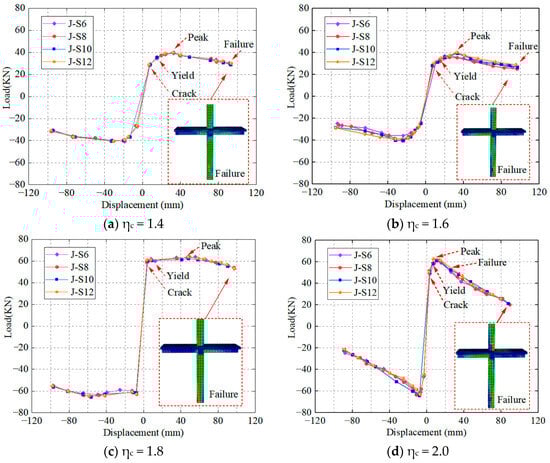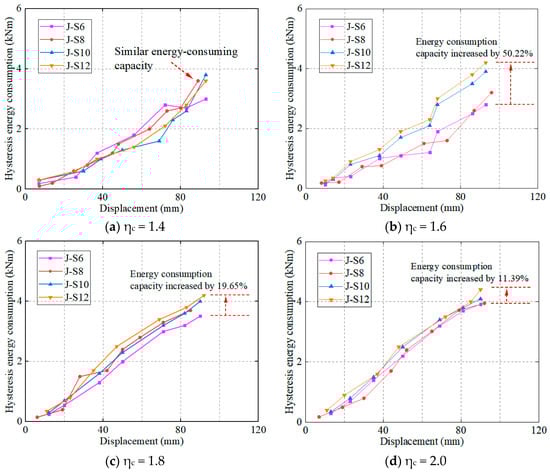 Figure 13 and Figure 14, respectively, depict the skeleton curves and energy dissipation curves of beam–column joints with different stirrup diameters (J-S6, J-S8, J-S10, and J-S12). The effect of different stirrup diameters on the seismic performance of beam–column joints is relatively small. The skeleton curves of various column end bending moment amplification factors are largely consistent. However, the increase in the column end amplification factor causes the structure to reach peak displacement earlier and enter the failure stage, corresponding to the stress concentration area of the FEA model. The increase in stirrup diameter slightly improves the load-bearing capacity and stiffness of the structure, and beam–column joints show better load-bearing capacity and deformation ability under higher column end bending moment amplification factors. For beam–column joints with different amplification factors, J-S8 exhibited a 5.22–10.56% increase in initial stiffness and a 3.48–6.74% increase in load-bearing capacity compared to J-S6. This indicates that the increase in stirrup diameter improves the integrity of the joint, which improves the initial stiffness. Additionally, the stirrups enhanced the shear resistance of the specimen, resulting in a slight increase in the load-bearing capacity of the joint.