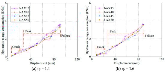 Figure 15 and Figure 16 show the skeleton curves and energy dissipation curves of beam–column joints (J-AX35, J-AX40, J-AX45, and J-AX50) based on different axial pressure ratios. Noticeably, for column end bending moment amplification factors of 1.4, 1.6, and 1.8, the maximum load-bearing capacity of the structure first increased and then decreased as the axial pressure ratio increased. Compared to that of J-AX35, the maximum load-bearing capacity of J-AX45 increased by 2.55–6.83%. However, when the axial pressure ratio increased to 0.5, a general downward trend in the maximum load-bearing capacity was observed. This phenomenon indicates that a slight increase in the axial pressure ratio can put the material in a triaxial stress state, leading to a slight increase in load-bearing capacity. Therefore, an excessively high axial pressure ratio may shift the triaxial stress state of the material to a uniaxial stress state, resulting in a slight decrease in load-bearing capacity.