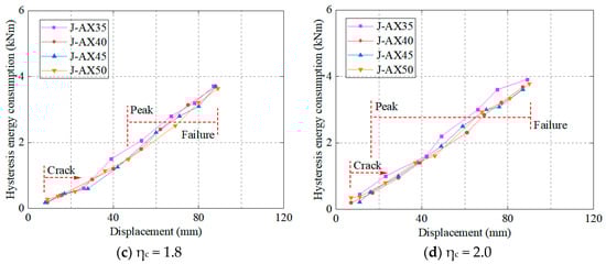 Figure 12 shows similarities in the trends of the cumulative energy dissipation curves of beam–column joints with different concrete strengths with changing displacement. Before cracking, the beam–column joints at all amplification factors are in an elastic state, but energy dissipation significantly increases after cracking. As the column end amplification factor increases, the dissipation capacity of J-C35 and J-C40 decreases because the increase in strength reduces the ductility of the concrete. Therefore, under cyclic loading, cracks in high-strength concrete develop rapidly, which lowers the hysteresis energy dissipation capacity of the specimen. Although beam–column joints made of high-strength concrete have advantages in terms of the load-bearing capacity and initial stiffness, their energy dissipation performance is lower than that of beam–column joints made of low-strength concrete.