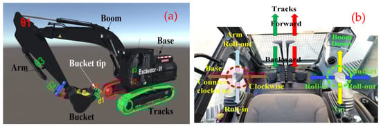 To assess the performance of coordinated excavator operations, it is necessary to evaluate the simultaneous execution of eight distinct actions, as shown in Figure 2. In Figure 2a, the boom, arm, bucket, and base represent the four degrees of freedom, and note that the bucket tip is a key control point for following calculations. Figure 2b illustrates how the right joystick controls the boom and bucket, while the left joystick regulates the arm and base. Both joysticks offer 360-degree rotational control, enhancing operational efficiency by reducing cycle times. In real-world applications, operators typically undergo 3–4 months of training to master coordination, develop muscle memory for these eight actions, and seamlessly combine them to perform tasks.