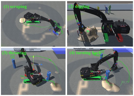 - Lack of Operational Flexibility: Even if the overall training succeeds by chance, the agent tends to execute operations in a mechanical, sequential manner during inference, which may not accurately represent real-world construction practices. For example, in practice, the excavator operator decides how many times to scrape the soil or whether to temporarily pause after excavation without immediately throwing the soil. In contrast, the trained excavator agent rigidly follows a predefined sequence of “scraping → digging → throwing → turning back”, as shown in Figure 3. Once the fully trained neural network is running, it cannot selectively perform certain intermediate steps while disregarding others. This “all-or-nothing” approach lacks the flexibility and reusability required for real-world applications.