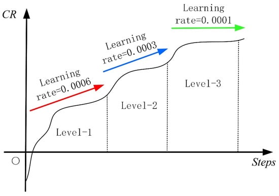 In cases involving multiple hierarchical divisions, there is a risk of gradient explosion within the loss function. To mitigate this, it is crucial to reduce the learning rate once success is achieved at each level, as depicted in Figure 5. When the maximum cumulative reward is reached, training can be safely stabilized within the global optimum of the loss function by applying a smaller learning rate. This strategy ensures that the entire reward process is well understood before training, making training objectives clear and controllable, progress easily trackable, and avoiding extended wait times for convergence.
