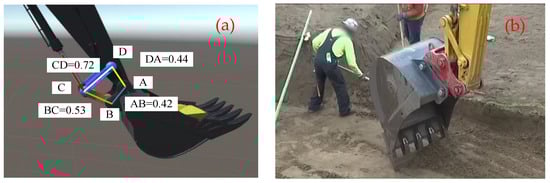 (3) Double Rocker Mechanism: To ensure accurate angular motion, mathematical constraints were applied to the two connecting rods of the bucket via a double rocker mechanism. As illustrated in Figure 7, the blue and red connecting rods, along with the bucket cylinder rod and the end of the forearm, form this mechanism, restricted by specific angular variations. In the scenario shown in Figure 7a, when the bucket cylinder rod pushes point C to rotate, point A’s rotation is limited by the length of the connecting rod. This mechanism was coded, and the length of the connecting rod can be replaced. To enhance the scraping angle, an additional red connecting part was introduced to the bucket (Figure 7b), allowing the bucket to open outward at an angle exceeding 120 degrees.