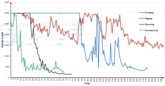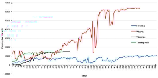 In the 3D simulation environment, the reliability of the proposed methods can be considered from both accuracy and speed. Each basic behavior is set with Euclidean distance and angle limits for joints in Table 4, Table 5, Table 6 and Table 7 as the “Desired result”. When the distance or angle reaches the limit value, the simulation is considered successful. Meanwhile, all four basic behaviors are early stage tasks, and when the cumulative reward reaches , the task can be considered completed quickly. Unlike the physical excavator in the objective world, the desired results in simulation calculations are defined by the angles between each joint. Therefore, reliability judgment is equivalent to comparing the numerical values of joint angles.