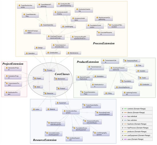 Step 2: Consider reusing existing ontologies. The CQs developed in the previous step can be fully or partially addressed by the ontological model proposed by EI-Diraby and Osman [], which assumes that a project consists of a set of processes where various actors control resources to produce products. This paper expands on the aforementioned model to develop a specialized ontology for power grid construction.