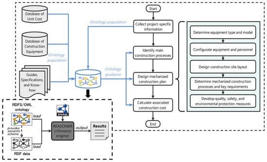 To generate mechanized construction plans, an ontology-guided workflow is proposed, as depicted in Figure 2. The process begins by collecting case-specific information to populate the ontology and build a comprehensive knowledge base. In addition to this, construction equipment data, unit price data, and specification data must also be pre-loaded into the ontology to form an integral part of the knowledge base. Subsequently, the ontology guides the identification of key construction processes for mechanization, the design of corresponding mechanized construction plans, and the calculation of associated costs. The design of the mechanized construction plan involves five further steps: determining the equipment type and model, configuring equipment and personnel, designing the construction site layout, specifying mechanized construction procedures, and developing corresponding quality, safety, and environmental protection measures. These steps ensure that the designed plan is practically applicable.