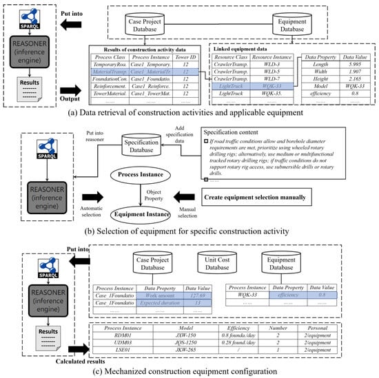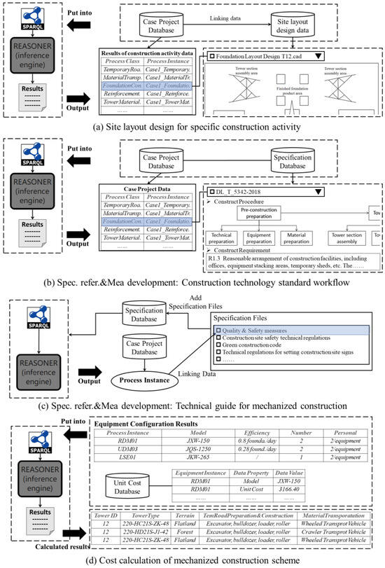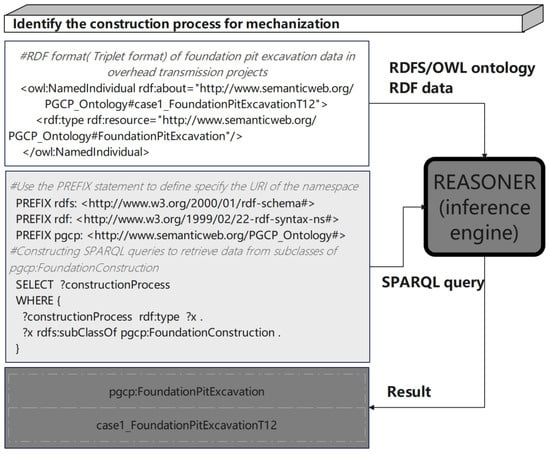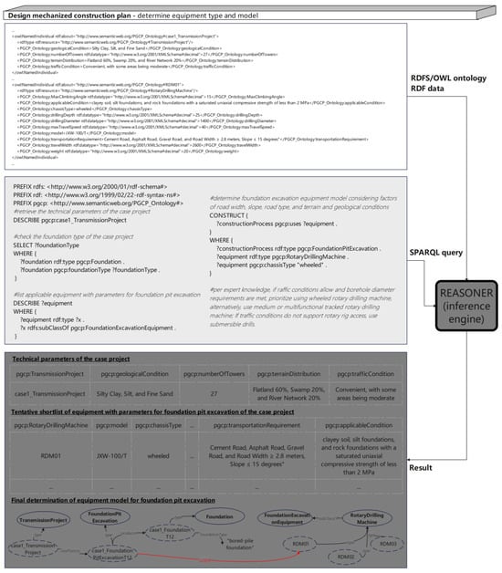 Figure 2 illustrates the ontology-guided mechanism for generating mechanized construction plans for power grid construction projects. The core technology underlying this process is reasoning with the RDFS/OWL ontology and RDF data. The ontology for power grid construction is expressed using RDFS/OWL, which serves as the semantic schema for modeling and organizing specific instances in RDF format based on real-life case projects. Both the RDFS/OWL ontology and the RDF instances are loaded into an inference engine, also known as a reasoner. This reasoner enables logical inferencing, allowing for the automatic deduction of additional knowledge from the given data. SPARQL queries are then executed on top of this reasoning layer to extract, manipulate, and analyze the data stored in RDF format, facilitating the generation of accurate and efficient mechanized construction plans.