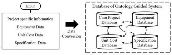 Figure 5 shows the foundation of the development system, from where the ontology population begins. The system facilitates the conversion of heterogeneous data—such as construction equipment data, unit price data, specification data, and case project data—into ontology-compliant instances in RDF. The conversion mechanism is based on the semantic mappings from source data models to the target ontology, as outlined in the previous work [,]. This process contributes to building a knowledge base (or an RDF triple store) that aids in generating a comprehensive mechanized construction plan for the case project.