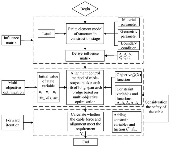 For long-span CFST arch bridges with numerous segments and intricate construction processes, cable force adjustments must be made repeatedly to satisfy multiple objectives concurrently. This necessitates the involvement of individuals with extensive experience in cable adjustment calculations. However, the tediousness of manual cable adjustment can be eliminated by utilizing MATLAB R2016a. The mathematical formulation implemented in MATLAB utilizes the cyclic loading method to tackle the problem [,,,]. It is important to ensure that the objective and constraint functions are continuous to prevent the occurrence of a locally optimal solution. In addition, the objective and constraint functions must be real numbers when the fmincon function is used for maximum constraint minimization. The steps involved in solving the alignment control problem of long-span bridge arch ribs using cable-stayed construction and multi-objective optimization are shown in Figure 1.
