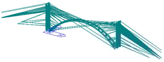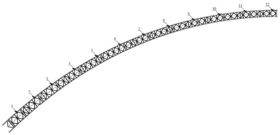 The Tian’e Longtan Bridge, which spans 624 m, is a rib-skeleton concrete arch bridge with a cable buckle design featuring divided cables, whereby the pulling end cable force is equal to the anchoring end. A single-bundle cable force was used during construction, whereas each arch rib segment consisted of two-bundle cables. The buckle cable was constructed of high-strength, low-relaxation steel strands with 1860 MPa Φ15.24 mm. A single steel strand has an area of 140 mm2 and an elastic modulus of 1.95 × 105 MPa. The anchor end comprises a low-retraction anchorage located at the buckle point close to the end of the hoisting arch rib segment. The control point is the intersection point of the arch rib upper axis and the top vertical web axis horizontally translated outward from the main chord during construction. The finite element model of the Tian’e Longtan Bridge has 7614 nodes and 15,545 elements, and its material properties, geometric characteristics, boundary conditions, and external load information are consistent with the design drawing data. The buckles are numbered based on the bridge’s construction stage sequence, owing to its symmetry. The modeling method is similar to that of Pingnan Third Bridge, the solid model is shown in Figure 4 below, and the finite element model is shown in Figure 5.