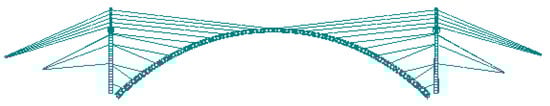 The Pingnan Third Bridge’s cable-stayed buckle system comprises two components: the buckle and the horizontal force adjustment cable. The cable buckle supports the cantilever assembly of the arch rib segment. At the same time, the ground stretching form is incorporated into the design for the safety and convenience of the cable buckle. The horizontal force adjustment cable consists of active and passive adjustment cables. In the event that the buckle tower is affected by unbalanced horizontal forces, the horizontal force adjustment cable regulates the tower’s deviation within a small range, mitigating the influence of the hoisting segment on the buckle segment elevation. The buckle cable was constructed from high-strength, low-relaxation 1860 MPa Φ15.24 mm steel strands, with a single strand’s area and elastic modulus (E) being 140 mm2 and 1.95 × 105 MPa, respectively. The anchor end of the buckle cable is secured with a low retraction anchorage situated close to the hoisting arch rib segment’s end at the buckle point. The overall layout of the cable-stayed buckle method is depicted in Figure 2. The Pingnan Third Bridge’s finite element model comprises 12,321 nodes and 24,251 elements, with material properties, geometric characteristics, boundary conditions, and external load information consistent with the design drawing data. Due to the bridge’s symmetry, the cable buckles are labeled based on the construction stage’s sequence. The modeling assumptions employed include steel’s ideal elastic material property and the plane section assumption for cross-section deformation. The finite element model is presented in Figure 3.