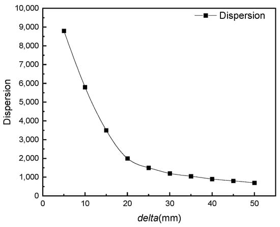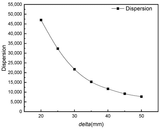 In this study, the arch rib installation stage was simulated based on the final construction sequence, which involved using the tower cable-stayed buckle cantilever assemblage method. The Pingnan Third Bridge and Tian’e Longtan Bridge hoisting stages were divided into 44 and 48 sections, respectively. The cable force was used to balance the arch rib segment self-weight load during the cantilever assemblage. The construction approach involved symmetrical installation on both sides, which started with installing the upstream and downstream arch ribs, followed by transverse connection between the segments, and finally, installing the next segment until cable closure. The objective function aimed to simultaneously satisfy three criteria, including minimizing the sum of squares of the difference between the mean value of the actual displacement of the cantilever end in the arch rib segments installation and the control point displacement of the cantilever end in the arch transverse brace installation caused by the bare arch weight. Furthermore, it sought to minimize the variance between the mean value and target displacement and reduce the influence of the tension buckle cable of the uninstalled segment of the arch rib on the displacement control point of the installed segment. A comparative analysis reveals that for the Pingnan Third Bridge, the inflection point of the optimization function dispersion occurred at delta = 30 mm, with the dispersion increasing exponentially as the delta decreased. When the delta > 30 mm, the dispersion delta tended to smooth; therefore, it is recommended that the difference between the actual and the target displacement of the control point should not be large, and the delta of the Pingnan Third Bridge should be selected between 30 mm to 35 mm. Similarly, the delta of Tian’e Longtan Bridge should be 40 mm~50 mm. This is illustrated in Figure 6 and Figure 7, which show the dispersion and delta variation curves for the Pingnan Third Bridge and Tian’e Longtan Bridge, respectively.