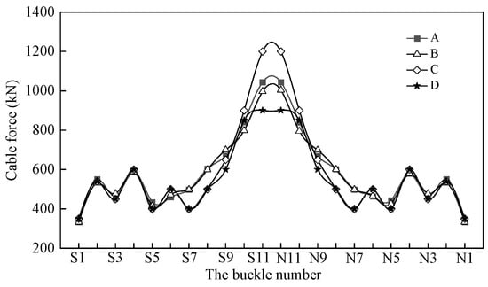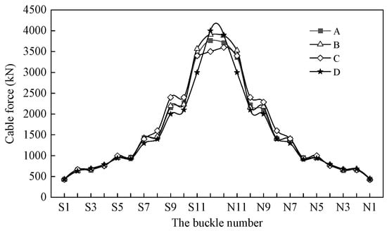 The comparison diagram of the initial iteration cable tension and optimized cable force of the Tian’e Longtan Bridge (unit: kN). Note: S = South, N = North, A = Cable force after upstream optimization, B = Cable force after downstream optimization, C = Cable force before upstream optimization, D = Cable force before downstream optimization.