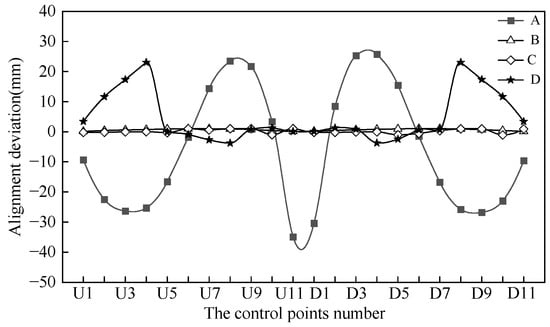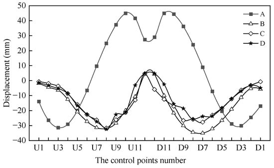 The multi-objective arch rib alignment control method was analyzed and calculated to investigate the displacement change in different segments’ cantilever end control points, as observed in Figure 10, Figure 11, Figure 12 and Figure 13. The results revealed a more gradual displacement change in comparison to other methods. The control points of the two adjacent sections displayed no significant displacement change, indicating good continuity in construction alignment. After the cable closure of the Pingnan Third Bridge and the Tian’e Longtan Bridge, the error between the control point elevation and the target alignment was 10 mm and 30 mm, respectively. During the hoisting construction of the Tian’e Longtan Bridge, the error between the control point elevation and the target alignment was less than 45 mm. All of the errors observed in the study met the required specifications. These findings demonstrate the effectiveness of the multi-objective arch rib alignment control method in achieving precise alignment during construction.