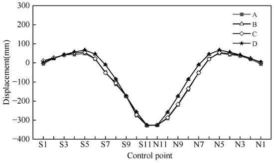 The comparison of in situ and theoretical data is presented using the Pingnan Third Bridge as an example, given that the Tian’e Longtan Bridge is currently under construction. During the in situ monitoring of the Pingnan Third Bridge, a one-time passive adjustment method for cable tension was utilized, and the optimization of cable tension was performed to achieve the convergence goal. Cable closure was carried out at a stable time of elevation and axis change, and the arch rib alignment was continuously monitored in situ. The displacement of the control point is presented in Figure 14 and analyzed using the multi-objective optimization method for arch rib alignment. Results show that the cable closure error of Pingnan Third Bridge is 3 mm. This precision adjustment method for arch rib alignment enabled control of each arch rib’s alignment during the hoisting construction process, while ensuring uniform cable force that met safety requirements. This approach effectively resolved the issue of repeated cable adjustments and offered the advantages of high efficiency and convenience.