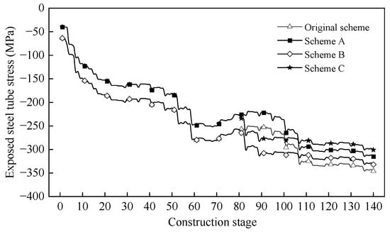 - The control cross-sectional stress of exposed steel tube in rigid skeleton arch bridge is related to the installation method and the concrete casting scheme. To achieve a good stress control effect, selecting the appropriate construction scheme to reduce construction risk is necessary.