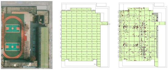 To gain insights into the students’ physical activity at the school level, this study investigated the following three categories: the PA type, PA spatial distribution and PA intensity. The study employed the following methods: first, individual students’ physical activity during recess was captured by the DJI Mini Drone over four observation days and then recorded in ArchGIS with precise geographic coordinates marked on the campus map. Attribute information such as gender, activity type and intensity was also input into the system. This allowed for the visualization of the spatial distribution of different PA types and their intensity levels at each school. Secondly, the outdoor areas where physical activity was observed at each school were divided into a 10 × 10 m grid using fishnet creation in ArchGIS, providing complete coverage of the outdoor spaces. Each student’s activity point was then assigned to the corresponding grid within this system (Figure 5) [39]. Quantitative calculations were conducted for each grid, treating them as spatial units across three key categories of physical activity (PA). These categories encompass the PA concentration level, PA richness level and PA overall intensity level. The PA concentration level involves tallying the total number of physically active students in each spatial unit. The PA richness level counts the total number of different types of physical activities in each spatial unit. The PA overall intensity level calculates the total activity intensity of all physically active individuals in each spatial unit. The grid values representing physical activity in these three categories were then meticulously analyzed using the fishnet tool in ArcGIS. Varied grade intervals were assigned using the natural breaks classification method, with darker colors representing higher grades and lighter colors indicating lower grades.