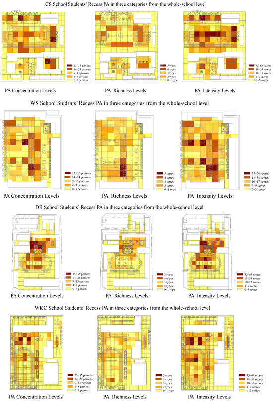 The four selected schools were visualized in three categories, including the PA concentration levels, PA richness levels and PA intensity levels, according to the grading division by the fishnet analysis in ArchGIS. The color of the grids, ranging from light to dark, represented grading from low to high. As shown in Figure 6, in terms of the PA concentration levels, high-grade space units (level 4~5) were mainly concentrated around the basketball court and table tennis court. These two types of sports are popular to watch, and their venues are relatively small, resulting in a high number of students participating in these activities and onlookers around the venue, leading to a relatively concentrated area. In terms of the PA richness levels, high-grade space units (level 4~5) were mainly concentrated in the track-and-field ground, where students would choose to run, jog, skip rope, long jump, walk and engage in other physical activities. Therefore, the track-and-field ground is the area where the number and types of physical activities are concentrated. In terms of the PA intensity levels, high-grade space units (level 4~5) were mainly concentrated in the basketball court, track-and-field ground and hard-paved squares. For example, both the DB school and WS school have limited campus land area and a compact functional layout. Due to the number of sports venues, numerous students choose to engage in physical activities such as badminton and basketball in the hard-paved square instead of a specific court.