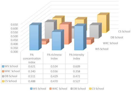 The previous section focused on analyzing the recess physical activity (PA) in outdoor public spaces at the spatial unit (grid) level. In contrast, this section examines the overall characteristics of recess PA at the school-wide level by selecting specific indicators. This allows for a comparison of the differences in PA patterns among the schools. The selected indicators are based on the following three categories: the PA concentration level, PA richness level and PA intensity level. These are referred to as the PA concentration index, PA richness index and PA intensity index. The table below provides an overview of the overall characteristics and specific quantification methods of the PA index constructed from these three categories (Table 3).
