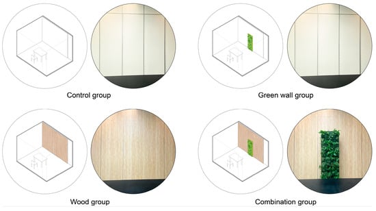 For visual connection with nature, a small green wall, measuring 1 m2 and composed of potted plants on a freestanding bracket, was set up. A small green wall is proposed due to its superior psychological and physiological effects compared to a larger one []. Green walls are visually more novel compared to familiar potted plants but are more troublesome and costly to maintain, making them more suitable for public spaces, such as workspaces, where the need for natural elements aligns with the requirements of the working population. For material connection with nature, a wall predominantly covered with wood was set up with dimensions of 3.6 m (L) × 3.0 m (H). Moderate wood coverage is more likely to make individuals feel comfortable while high coverage makes individuals tired []. In addition, a condition combining both patterns was set up, with the green wall overlapping the wooden wall. A condition without biophilic design was used as a control group.