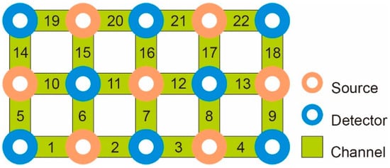 The fNIRS device (NirSmart) used near-infrared light at wavelengths of 760 nm and 850 nm. In total, 7 light sources and 8 detectors were configured for the device, allowing channels to cover the prefrontal cortex (PFC) due to its important role in cognitive control []. The arrangement of channels is shown in Figure 2 and the sensors were evenly spaced at a 3 cm distance from each other.