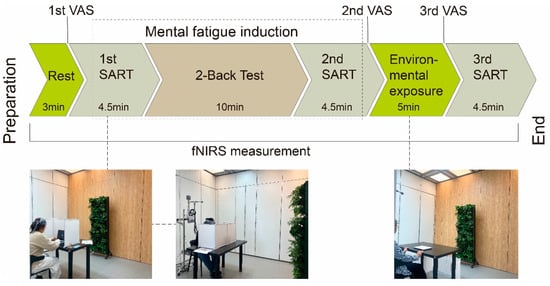 As shown in Figure 3, the participant rested for 3 min to allow the fNIRS to acquire resting-state physiological data as a baseline. Afterward, the participant filled out the 1st VAS and performed the 1st SART. The subsequent 2-back test, employed to induce mental fatigue in the participant [], was set for 10 min. A fatigue induction phase is critical for studying restorative effects []. The participant then performed the 2nd SART and filled out the 2nd VAS. During the environmental exposure phase, the participant rested for 5 min while looking ahead. A minimum of 5 min of nature-related activities was suggested to yield positive psychological outcomes [], while participants may feel bored [] and results may be interfered with if longer than 5 min. In the end, the participant filled out the 3rd VAS and performed the 3rd SART. Given the potential impact of non-environmental physical parameters on cognitive performance [], a white occlusion was placed on the table to prevent visual contact between the participant and the environment, except during the environmental exposure phase. The 1st SART, 2-back test, and the 2nd SART can be regarded as an entire mental fatigue induction phase, considering that the SART itself induces cognitive load. The whole experiment took about 50 min.