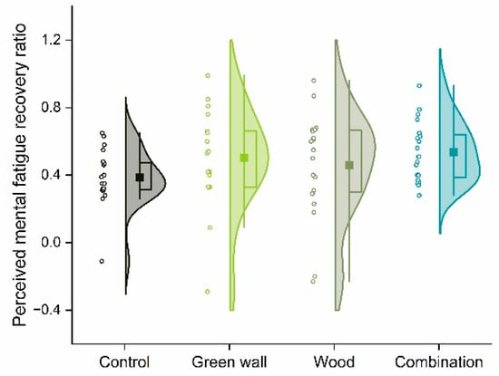 The perceived mental fatigue recovery ratio of the control group, green wall group, wood group, and combination group are, respectively, 0.39 (0.17, SD), 0.55 (0.22), 0.46 (0.31), and 0.53 (0.17). Levene’s test of homogeneity of variance showed no heterogeneity of variance in the perceived mental fatigue recovery ratio (p = 0.058), and ANOVA was used further. As shown in Figure 4, the result of ANOVA indicated that there was no significant difference in the perceived mental fatigue recovery ratio among the four groups (p = 0.241).