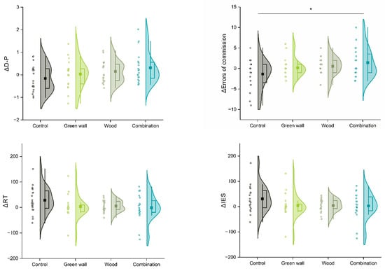 The SART performance results indicated that the participants in the combination group had a larger difference in errors of commission (incorrect response for the target) before and after the environmental exposure compared to the control group. This suggested fewer errors of commission, indicating greater accuracy following the environmental exposure. Given the absence of a significant difference in ΔRT, it can be inferred that the combination had a more favorable effect on cognitive performance in terms of restoration. The difference in cognitive performance before and after exposure corresponded to the degree of attention restoration objectively.