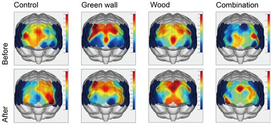 According to ART, the core of restorative experience includes four components: fascination, being away, extent, and compatibility. Fascination refers to stimuli that attract attention softly, while extent refers to enough richness and coherence []. Although the presence of green plants or the texture of wood can softly attract attention, an essential factor for restoration, this alone may be insufficient for the restoration process to occur. By enriching the elements within the space, the combination of these features seemed to enhance their harmony and the overall coherence of the environment, where the elements were organized in a relatively reasonable and orderly way, thereby improving the restoration process to some degree. An EEG study comparing restorative and non-restorative environments found that a perceived sense of coherence within the environment resulted in increased alpha/theta synchronization in the brain. This synchronization suppresses lower visual inputs, allowing the brain to focus more on self-restoration [].