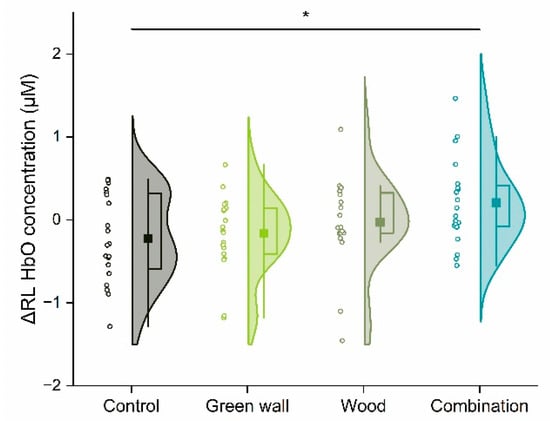 The ΔRL HbO concentration of the control group, green wall group, wood group, and combination group are, respectively, −0.22 (0.53, SD), −0.16 (0.46), −0.03 (0.54), and 0.21 (0.52). The assumption of homogeneity of variance was upheld (p = 0.631). The result of ANOVA indicated that there was a significant difference in ΔRL HbO concentration among the four groups (F (3, 75) = 2.76; p = 0.048). As shown in Figure 7, the ΔRL HbO concentration in the combination group was significantly higher compared to the control group (0.43, 95% CI [0.004, 0.858], p = 0.047).