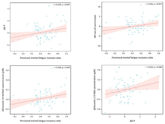 The delta values of the difference between symmetric channels before and after the environmental exposure were also included in the correlation analysis as they were important components of the ΔRL HbO concentration. The Pearson correlation coefficient revealed significant positive correlations between the perceived mental fatigue recovery ratio and the following variables: ΔD-P (r = 0.238, p = 0.035), ΔErrors of commission (r = 0.262, p = 0.019), and ΔChannels 14–18 HbO concentration (r = 0.308, p = 0.006). Additionally, a significant positive correlation was observed between the ΔChannels 5–9 HbO concentration and ΔD-P (r = 0.223, p = 0.048). Although the correlations are statistically significant, they are considered weak (Figure 8).