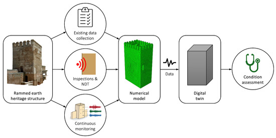 In light of this situation, the present study aims to develop a methodology for assessing the structural health of rammed earth constructions based on the combination of dynamic identification and nondestructive testing techniques, enabling the preventive preservation of heritage RE structures. Taking into account the limitations observed in the literature, where little attention is given to earthen constructions and the focus is primarily on specific case studies or single data sources, this study seeks to provide a comprehensive methodology for the integration of multiple complementary techniques for the condition assessment of heritage RE buildings. These techniques include documentation analysis, field inspections, NDT, long-term structural monitoring, structural digital twins, and nonlinear FEM simulations for the holistic assessment of the structural integrity of the structure. The following sections describe and justify the proposed methodology and analyze the experiences and results obtained to date from a specific case study, the Tower of Muhammad in the Alhambra of Granada (Spain), analyzing data from a continuous monitoring campaign conducted between January and March 2022.