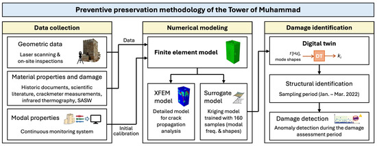 Rammed earth construction, an ancient and sustainable building technique, faces significant preservation challenges, particularly in historical contexts. This study aims to enhance the preventive preservation of rammed earth historical heritage through a comprehensive methodology combining continuous monitoring, architectural inspections, and data fusion. By integrating nondestructive testing techniques such as ultrasound, thermography, and ground-penetrating radar with operational modal analysis and modeling, the proposed approach allows for early detection and assessment of structural vulnerabilities. This methodology was applied to the Tower of Muhammad in the Alhambra of Granada, Spain, demonstrating its effectiveness in identifying and quantifying damage and predicting structural health. Using multi-source data (documentation, inspections, nondestructive tests, and continuous monitoring), a finite element model was built, calibrated (achieving an avg. error in modal frequencies of 1.28% and a minimum modal assurance criterion value of 0.94), and used to develop a surrogate model able to predict the modal properties of the tower in 0.02 , becoming compatible with continuous system identification. The presented results highlight the importance of continuous data acquisition and advanced diagnostic tools for safeguarding rammed earth structures against environmental and anthropogenic threats. This study advocates for the adoption of digital twins in historical preservation, facilitating informed decision-making and sustainable management of cultural heritage.