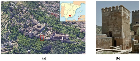 The Tower of Muhammad (Figure 4), also referred to as the Tower of the Hens due to its use as a chicken coop in the 19th century, was constructed in the 13th century, during the early Nasrid period [58,59]. Located in the north wall of the Alhambra fortress, it occupies a strategic defensive position between the Alcazaba fortress and the Royal Palaces. The tower was built in rammed earth stabilized with lime [60,61,62], and, over the centuries, it has undergone numerous alterations and modifications, some of which have compromised its structural integrity.